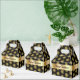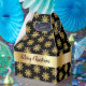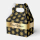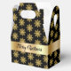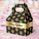 This elegant favour box is black with a beautiful pattern of gold coloured snowflakes. In the middle of the box there's a wide gold coloured band. On the front and back the text reads "Merry Christmas". This text can be customised.