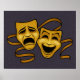 Vector illustration of gold comedy and tragedy theatre masks with a gold ribbon. Tags: acting, actor, cinema, comedy, drama, film, frown, grief, happy, humour, joy, laugh, mask, movies, performance, sad, theatre, tragedy, smile, theatre, dinner, live, gold, metal