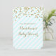 Personalised baby shower invitations with gold confetti pattern and light pastel sky blue and white stripes with handwritten style lettering. Customisable with your text.