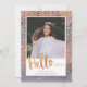 Send New Year greetings in style with these modern photo cards, featuring faux gold foil confetti over a gradient watercolor background. Card contains text templates on the back for more personalisation.