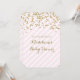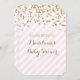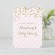 Personalised baby shower invitations with gold confetti pattern and light pastel blush pink and white stripes with handwritten style lettering. Customisable with your text.