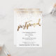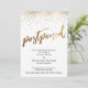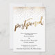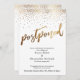 If you need to notify your tribe of an updated wedding date, this festive design could be just the piece you're looking for! In this design, the hand-lettered script font was used to create a graphic that reads "postponed", large and bold; the image has been embellished with a faux-metallic gold effect. The top of both sides have been accented with an image that simulates matching gold confetti that seems to fall from above.. Use the template fields to add your personal details and make this unique, modern design your own. The background can be changed to any colour you prefer. // 100 //