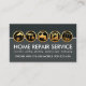 A dark blue shades layered cover features five gold handyman-construction icons which represent some of the work you may offer e.g. the drill-measuring tape can represent remodeling, the brush for home painting, the faucet for plumbing services, washing machine for electrical repairs and the spades-fork for landscaping or gardening. Below this is the business name "HOME REPAIR SERVICE" alongside a list of possible services. ; You can change the caption remarks to suit your own service needs. After this comes your contact details.
