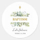This image displays a beautifully designed baptism Sticker. The top of the design features a simple, elegant cross symbol, indicative of the Christian significance of the event. Below the cross is a lush arrangement of watercolor greenery, with various shades of green leaves that add a fresh and natural touch to the design. The text is thoughtfully laid out with a mix of classic and modern fonts, emphasising an elegant baptism ceremony. The name of the child is featured prominently, indicating the child to be baptised.