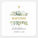 This image displays a beautifully designed baptism Square Sticker. The top of the design features a simple, elegant cross symbol, indicative of the Christian significance of the event. Below the cross is a lush arrangement of watercolor greenery, with various shades of green leaves that add a fresh and natural touch to the design. The text is thoughtfully laid out with a mix of classic and modern fonts, emphasising an elegant baptism ceremony. The name of the child is featured prominently, indicating the child to be baptised.