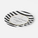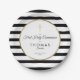 Classic black and white stripe First Holy Communion paper plate featuring a gold cross with an elegant faux gold foil border that frames your special celebration event details set in modern typography. Designed by Thisisnotme©