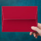 A trio of gold deer silhouettes leap across a bright red and gold patterned background on the interior of this holiday envelope. Beautiful, elegant and classy, with a dark red exterior.