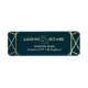 A modern wedding return address label, features a "faux foil" gold geometric pattern over a dark turquoise background. All your details are spelled in a beautiful modern typo.