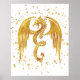 Gold Dragon In The Stars Poster on White Backdrop - In a dark room, a single light illuminates a magnificent golden dragon as it flies majestically in the stars. Printed against a pure white backdrop, this poster is an ethereal addition to any wall. Perfect for anyone who loves dragons, this poster is sure to bring enchantment to your home.