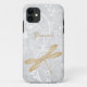 Protect your iPhone 11 with a Gold Dragonfly Personalised iPhone 11 Case. Case design features a colourful dragonfly, a soft white floral vine against a light grey grunge damask background with an area to personalise with your name. Additional gift items available with this design as well as a variety of colours. Personalise for yourself or makes a great gift.