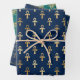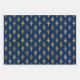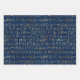 Fun trio of gift wrap sheets featuring various Egyptian hieroglyphs in gold patterns on dark blue and teal background