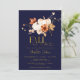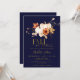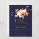 Gold Fall In Love Rust Cream Pumpkin Bridal Shower Invitation. Rustic and elegant bridal shower invitation featuring hand painted watercolor white pumpkins, fall leaves and flowers with golden "fall in love" wording and navy blue background. Please get in touch via chat if you need customisation or matching items.