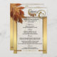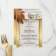 A shabby chic wedding menu card featuring colourful fall leaves on a rustic white weathered wood panel, framed by a golden lining and festive metallic swirls. A beautiful and elegant card for an autumn dinner table.
