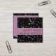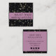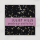 Classy square business card featuring glittery gold flakes on a black card, with pink banner. Your contact details, including phone, email, website and social media handle are on the reverse side. You can customise further to remove icons for social media that you do not use, and reposition icons if necessary.