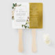 Floral wedding program fans featuring blush pink peonies, wild herbs, cotton and lilies with gold geometric frame customisable to your event specifics.