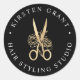 Label your correspondence or products with these chic stickers that match our Floral Scissors logo branding suite for hairstylists and salons. Rich black stickers feature a faux gold foil scissors illustration in the centre, with two text fields curving around the outside, in classic white lettering.