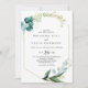 This gold floral with tropical greenery casual wedding invitation is perfect for a destination wedding. The design features predominantly hand-painted watercolor green foliage coupled with gold flowers, adorning an elegant geometric frame.