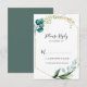 These gold floral with tropical greenery RSVP cards are perfect for a destination wedding. The design features predominantly hand-painted watercolor green foliage coupled with gold flowers, adorning an elegant geometric frame.