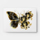 Gold flower butterfly with black jewellery orchid, decorated with gold leaves on white background.