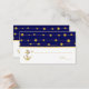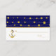 Gold foil anchor and beads modern navy blue nautical wedding escort place card featuring an anchor made of FAUX gold foil and a pattern border of golden balls that look like beads on the rope on navy blue background. Your text is in gold on white with gold outline. This elegant, stylish and contemporary wedding design is a completely customisable template and is part of a wedding collection or set perfect for a summer beach wedding. Note that THERE IS NOT REAL GOLD FOIL JUST PRINTED IMAGES.