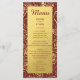 A luxurious design featuring your menu details on a classy gold background with a frame depicting a romantic floral motif in gold on a deep burgundy. You can personalise it by clicking on the customise link. This is part of a classy wedding suite with many matching elements.