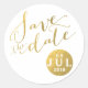 Gold Foil Glamour Handwriting | Save the Date Stickers. Elke Clarke© Modern minimalist design with the words "Save the Date" in gold handwriting script. A gold dot for the wedding date and white text for the wedding date. Gold foil is a printed photo effect. Other colours available in or shop.