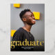 Elegant gold foil graduation photo announcement features a portrait or vertical orientated photo on the front, with "graduate" overlaid in bold gold foil lettering ,and your graduate's name, class of and graduation year beneath.