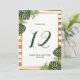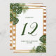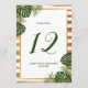 Celebrate in style with these stylish and very trendy wedding table number cards. The design features a chic striped white and gold foil effect background with tropical palm leaves and matching wording in a deep shade of green... stunning and simply perfect for any couple planning a destination or beach themed wedding celebration. The design is easy to personalise with your special event wording and your guests will be thrilled when they see these fabulous table numbers.