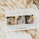 A glamourous gold foil heart calligraphy script save the date featuring three customisable engagement photo panels. The shimmering foil lettering adds a luxurious touch perfect for formal or garden weddings. Personalise with your names, date, location, and wedding website URL to create a stunning first impression for your guests.