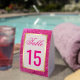 Elegant table number cards featuring a faux gold border and a beautiful faux pink glitter background.