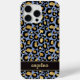 Customize this gold foil leopard print on a blue brushed metallic background iPhone 15 pro max case with your your name in a trendy modern script font in a coordinating gold on black.