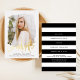 Trendy graduation party invitations featuring the graduate's photo inside of a textured mask frame with "Graduate" in a handwritten gold foil script. Personalise the front of the photo graduation party invite by adding the graduate's name, school name, and graduation year. The invite reverses to display your graduation party details with a black and white striped design.
