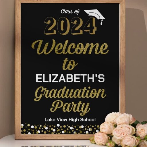 The "Gold Foil Script S’more Confetti Black Grad Sign" is a stylish and eye-catching graduation sign designed by CaMiDesigns. It features a bold calligraphy design paired with gold confetti and a graduation cap, making it the perfect centerpiece for any graduation celebration. For orders, shipping, product information, and assistance, please contact Zazzle Customer Care directly.