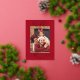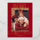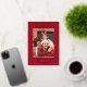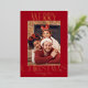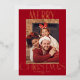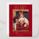 Celebrate the season with our modern trendy red photo Christmas Card! This card has a white script photo design and a personal greeting message at the back.