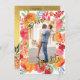 Beautiful, fresh orange, peach, pink, red flowers with eucalyptus and green ferns Save the Date invitations. Accents of faux gold foil. Just change the photo shown with your photo.