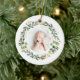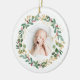 Elegant, modern and pretty baby photo Christmas ornament. This template featuring a floral wreath with gold & green foliage and red berries. Revere to reveal an adorable illustration of Green baby dinosaur sleeping under the gold yellow stars with custom Baby's name. Great for both baby boy and girl. Perfect gift for all seasons!