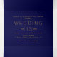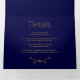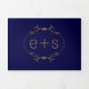 Elegant gold frame and initials monogram navy blue tri-fold wedding invitation. It showcases your initials in a gold frame with leaves on blue on the the cover. The inside panels include your text while there is a photo on the outside back and the date of the wedding on the outside flap.