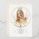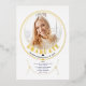 Celebrate your graduation with our Class of 2025 graduation photo invitation. This design showcases a beautiful golden frame against a white backdrop, enhanced with elegant gold foil accents. Your photograph takes centre stage, surrounded by the word 'GRADUATE' in gold foil. The design itself is reminiscent of a chic wire choker, featuring two circles and two overlapping semi-circles. Flip the invitation over, and you'll find the text 'Class of 2025' presented diagonally in luxurious gold on a clean white background.