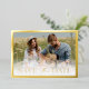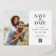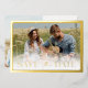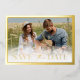 Gold Frame Save The Date Foil Invitation. Simple and stylish, this elegant save-the-date wedding announcement card features a classy border and elegant calligraphy script pressed in real gold foil with 1 vertical photo and 1 horizontal photo and a QR code for personalising. There is an optional white photo overlay at the bottom that can easily be deleted if you choose.