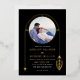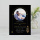 An elegant wedding invitation made of exquisite gold foil that features the couple's photo positioned against a dark background. This modern invitation presents your photo and text in a captivating frame resembling delicate wire jewellery, complemented by a leaf detail on one side and an arrow on the other. The backside displays a diagonal pattern of the couple's names in gold on black, adding a sophisticated touch of grace.