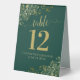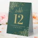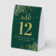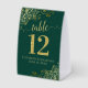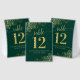 These beautiful table tent signs will make it easy for your guests to find their tables at your wedding reception. The elegant emerald green and gold design features lacy script calligraphy with ornate floral curls and swirls in the corners. There is space for the names of the couple and the wedding date.