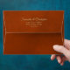 This beautiful wedding envelope is features a marbled rust orange or burnt umber coloured background with gold floral curls and swirls on the inside flap. There is a printed return address on the back flap in fancy script lettering. The design is understated and simple, yet classic, chic and ornate. Perfect way to make your wedding invitations all the more special.
