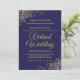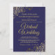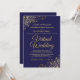 Just because you've been forced to move your wedding to a virtual ceremony, doesn't mean you can't send out beautiful invitations. This elegant invite features fancy gold script lettering on a navy blue background with lacy floral filigree or curls and swirls in the corners. Perfect way to invite your friends and family to share in your special day, even if they can't be there in person.