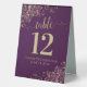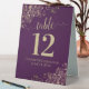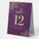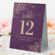 These beautiful table tent signs will make it easy for your guests to find their tables at your wedding reception. The elegant plum purple and gold design features lacy script calligraphy with ornate floral curls and swirls in the corners. There is space for the names of the couple and the wedding date.