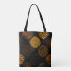 Trendy gold geometric abstract circles pattern over black background. Customisable tote bag template