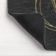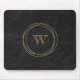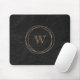 This elegant design features a gold monogram initial in open serif font framed by three irregular gold wire circles on a black background.