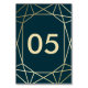 A winter wedding table number, features a "faux foil" gold geometric pattern over a dark turquoise background. All your details are spelled in a beautiful modern typo.