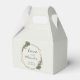 Boho style Baby Shower Favour Box with "Love and Thanks" in an elegant script along with your name and event title, inside of a gold geometric frame surrounded by greenery and white flowers. These botanical themed favour boxes with a gender neutral design are great whether you are having a boy or a girl.