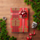 A very stylish and festive modern Christmas wrapping paper, featuring a pattern of gold gift boxes with large bows on top, in a pattern over a bright, metallic red background.