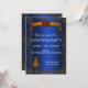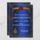 An elegant gold and blue Christmas party invitation featuring a golden banner with seasonal red poinsettia and a gold Christmas tree on a royal blue background, all framed with gold glitter. The reverse of the card features the red poinsettia bouquet. (Designer notes: please note this invitation can be completely customised for any type of Christmas-themed party you wish, including Christmas birthday party invites, Christmas wedding invites, and more).